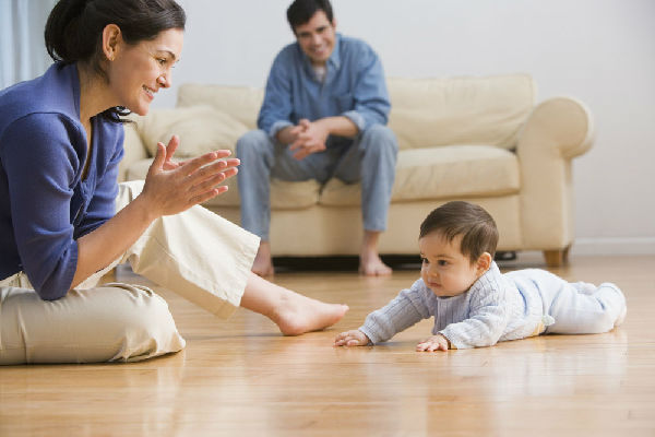 2、牵宝宝右手,妈妈推宝宝左腿,反之亦然,协助宝宝从自己的那边爬到爸爸这边来。