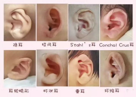 耳廓形态畸形有8种,分别为:垂耳,Stahl's形耳,耳轮畸形,环缩耳,杯形耳,招风耳,conchal crus耳,隐耳。很多耳廓畸形是混合存在的(含2种或以上的畸形)。
